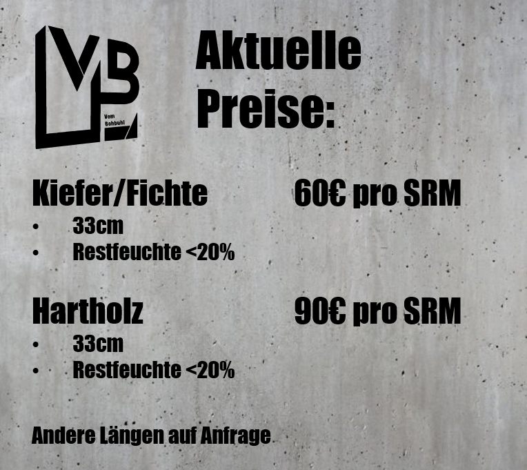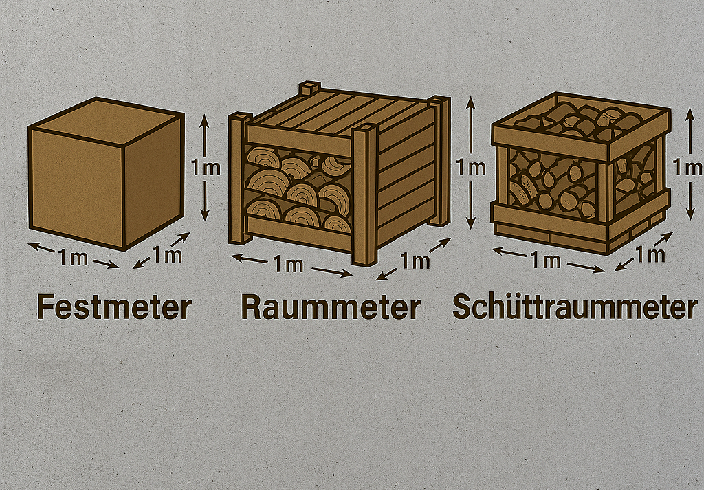 Um die Preise im Internet vergleichen zu können, hier eine Veranschaulichung (Festmeter = FM, Raummeter/Ster = RM, Schüttraummeter= SRM):